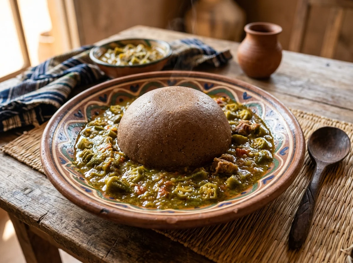トー(Tô / Toh) は、ソルガム(モロコシ)やミレット(トウジンビエ)の粉を水で練り上げた、もっちりとした食感の主食です。日本のお餅と西アフリカのウガリの中間のような食感で、口に入れると穀物の素朴な甘みがじんわりと広がります。ブルキナファソでは朝昼晩を問わず食卓に上がり、必ずソース――とりわけオクラソース(sauce gombo)やバオバブの葉のソース(sauce de feuilles de baobab)――と組み合わせて食べます。