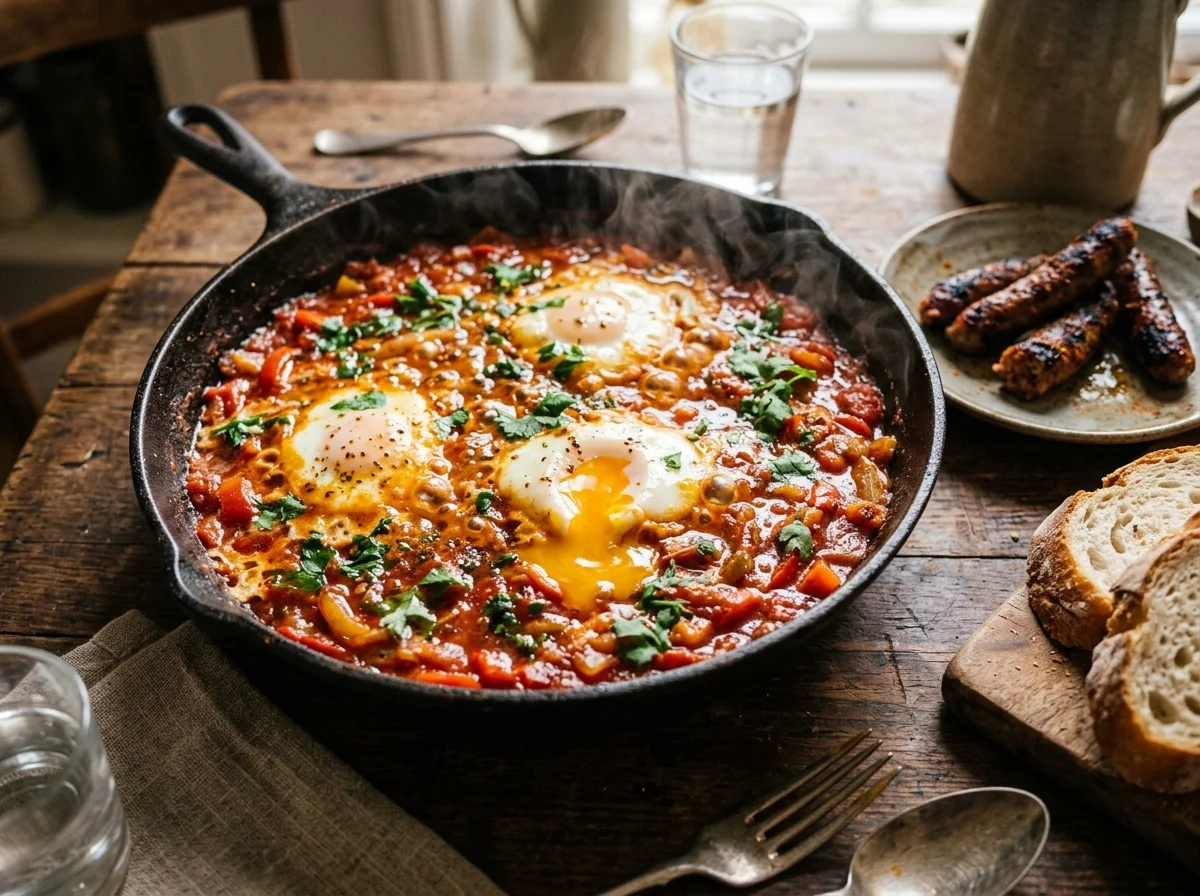 チャクチョウカは、パプリカ、トマト、卵というどこにでもある食材を、ハリッサとキャラウェイの力で「北アフリカの朝食」に変身させる魔法のような料理です。
