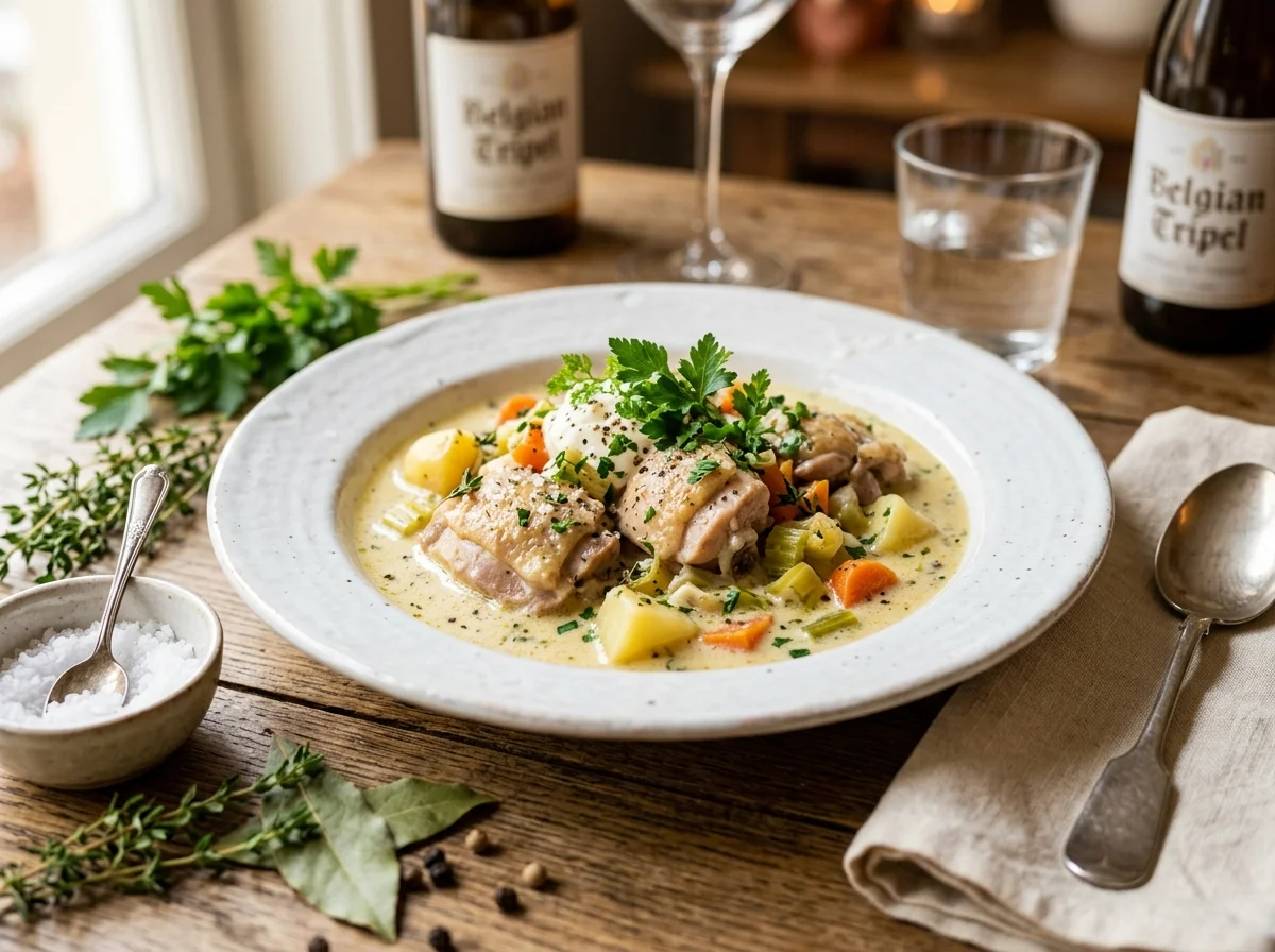 フラマン語で「水で煮たもの」を意味するフランドル地方の伝統料理。もともとはゲントの運河で獲れた淡水魚(パイク、ウナギ、コイ)で作られていたが、19世紀以降に鶏肉版が主流となった。鶏もも肉と根菜をブロスで煮込み、最後に卵黄と生クリームの「リエゾン」で仕上げる。ゲント市の観光局が「ゲントの公式料理」として国際的にPRしている。