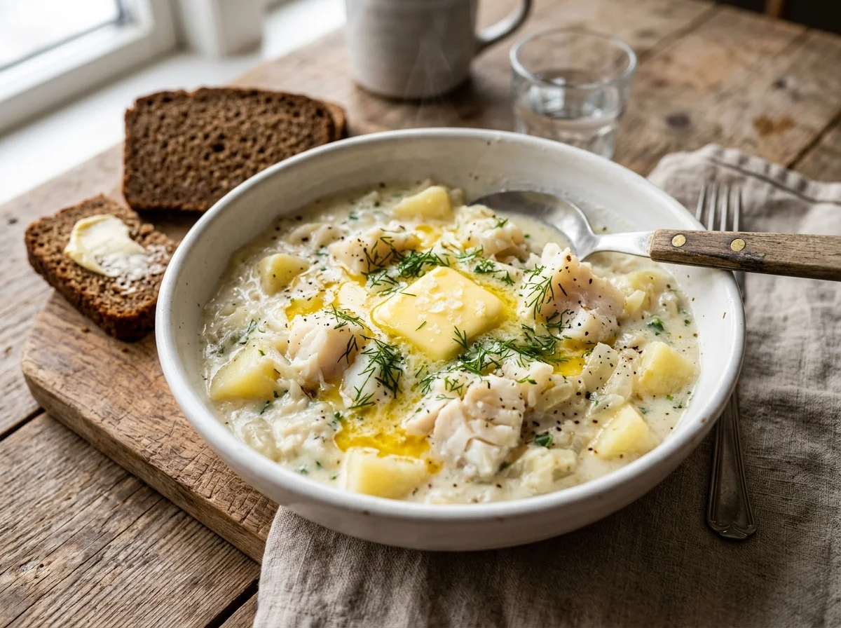 アイスランド語で「崩した魚」の意。タラ(主に塩ダラ)とじゃがいもを茹でて粗く潰し、玉ねぎ・バター・牛乳で仕上げる伝統的な魚シチュー。アイスランドの家庭では週に一度は食卓に上るとされ、学校給食の定番メニューでもある。起源は少なくとも18世紀に遡り、漁師が船上で余った魚とじゃがいもを混ぜて食べたのが始まりとされる。