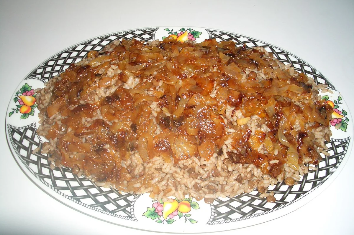 アラビア語で「あばた(天然痘の跡)」の意味。レンズ豆と穀物(米またはブルグル)を炊き合わせ、カラメル化した揚げ玉ねぎを乗せた中東の伝統料理。レバノン、シリア、パレスチナ、ヨルダン、イラク、エジプトなど広い地域で食べられている。完全菜食でありながら、豆と穀物の組み合わせで良質なタンパク質が摂取できる「完全食」として知られる。中東料理の全体像は中東料理入門を参照。