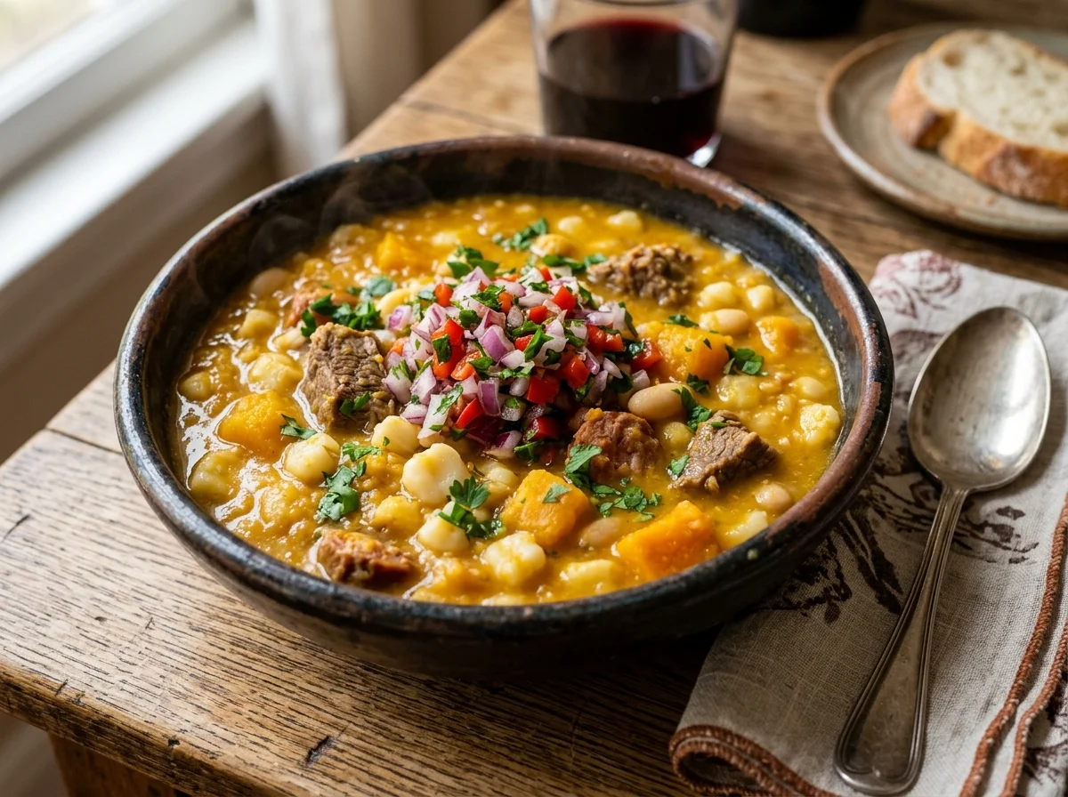 ロクロは、白とうもろこし・カボチャ・白いんげん豆・牛肉(または豚肉)をスパイスとともに数時間煮込んだ、黄金色の濃厚なシチューです。先住民ケチュア族が何千年も前から作り続けてきた料理で、「ロクロ」という名前自体がケチュア語の「ruqru」(シチュー)に由来します。