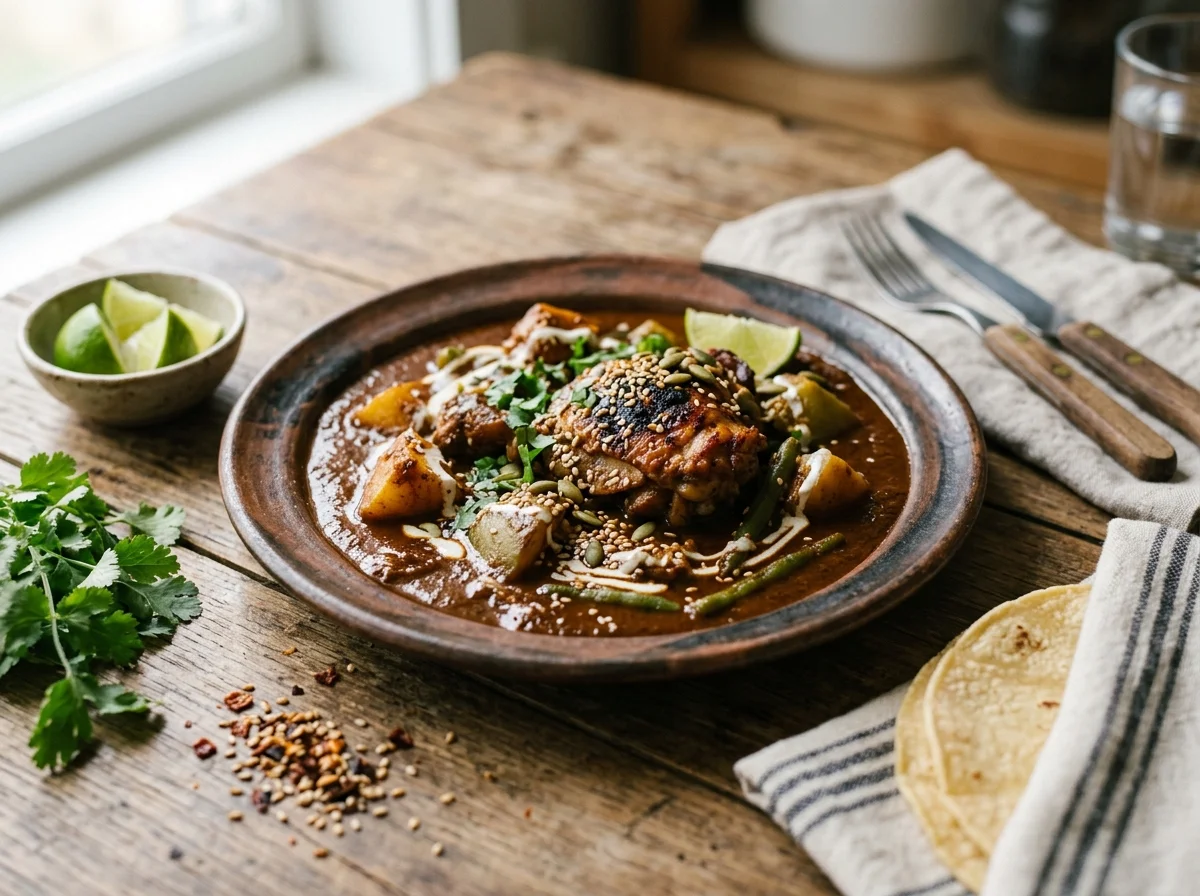 メソアメリカの種子ソース: モレ・ポブラノはメキシコの代表料理で、30種以上のスパイスとチョコレートを使う極めて複雑なソース。ペピアンと同じ「種子ソース」の系譜だが、味わいは全く異なる。両方作り比べることでメソアメリカの食文化の幅が理解できる。