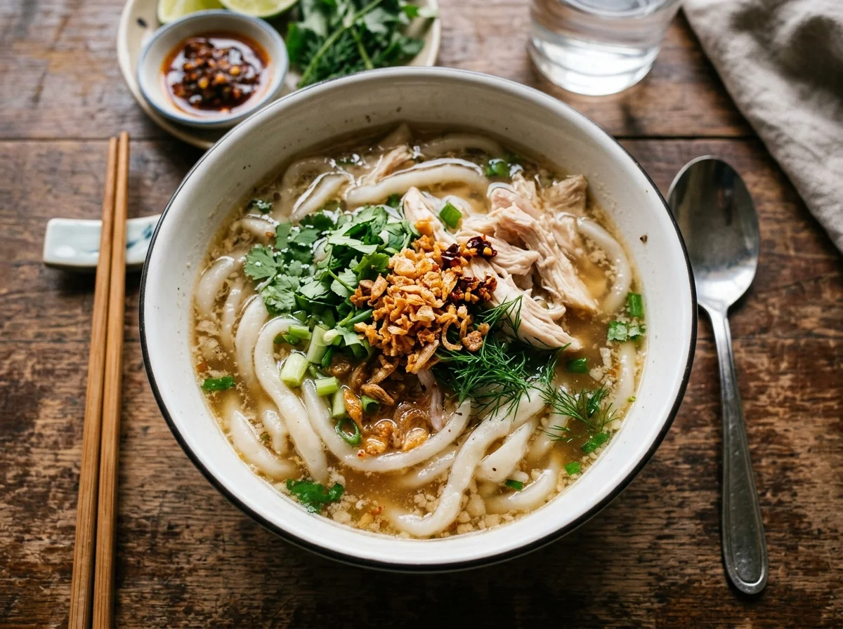 カオピヤックセンを他の麺料理と区別する最大のポイントは、麺をブロスで直接煮ることです。別茹でするとスープにとろみがつかず、カオピヤックセンではなく単なるチキンヌードルスープになってしまいます。英語圏のラオス料理研究家の間でも「no separate boiling(別茹でしない)」はカオピヤックセンの最低条件として共有されています。