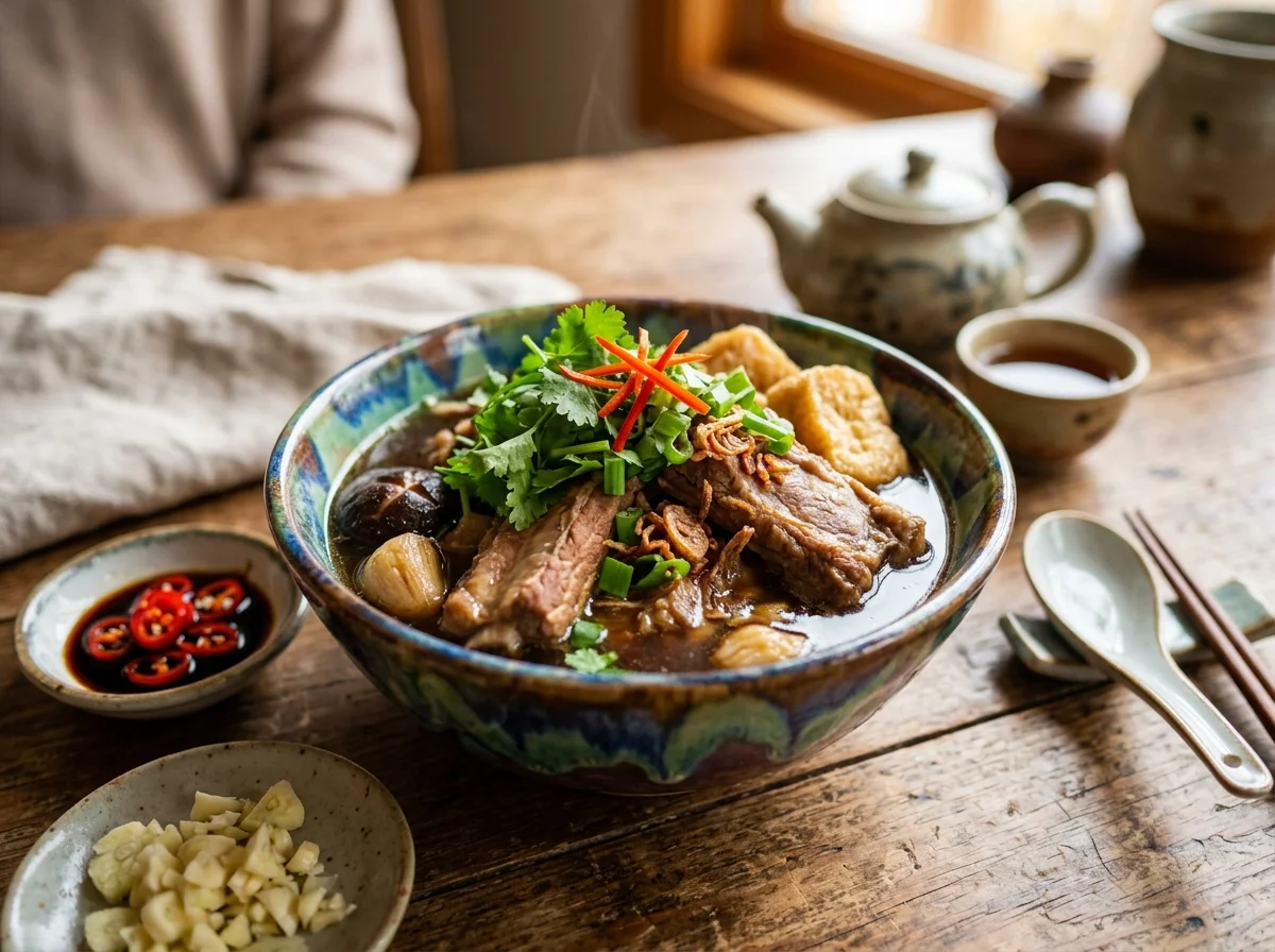 バクテーの魅力は、**西洋のコンソメやフォンとは根本的に異なる「漢方のうま味」**にあります。八角(スターアニス)、桂皮(シナモン)、丁字(クローブ)、当帰、玉竹、党参——これらの漢方薬材が骨付き肉のゼラチン質と溶け合い、体の芯から温まる深い味わいを生みます。一口啜れば、なぜ東南アジアの華人たちがこのスープを100年以上愛し続けているのかが即座に理解できるでしょう。